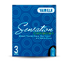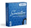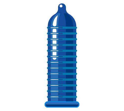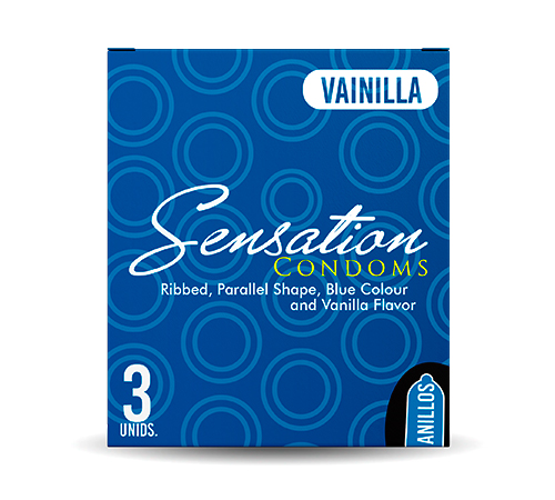 Condón masculino, anillado, forma paralela, color azul y sabor a vainilla usado como un método anticonceptivo de barrera o para prevenir las enfermedades de transmisión sexual.